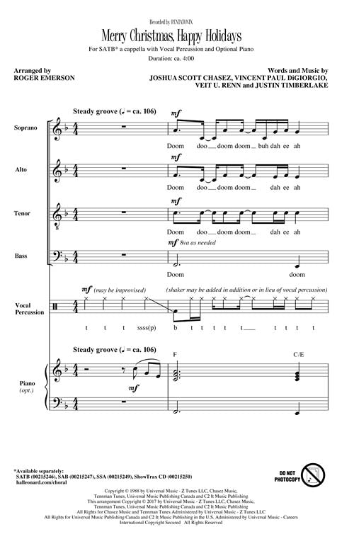 This Title Comes In Quantities Of Five (5) Copies(1 Order=5 Copies) Merry Christmas, Happy Holidays Octavo SATB From the 2016 album A Pentatonix Christmas, the popular vocal group puts their unique stamp on the 1998 holiday...Regular price $41.99 -