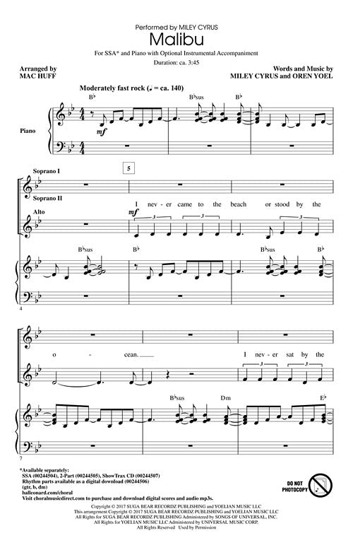 Malibu Pop Choral Series Ssa Miley Cyrus