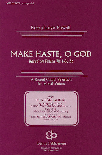 This Title Comes In Quantities Of Five (5) Copies(1 Order=5 Copies) Make Haste, O God Publisher: Fred Bock Music Company Category: Choral Series: Gentry Publications Format: Paperback Under the heading Three Psalms of David, popular writer...Regular price $16.99 -