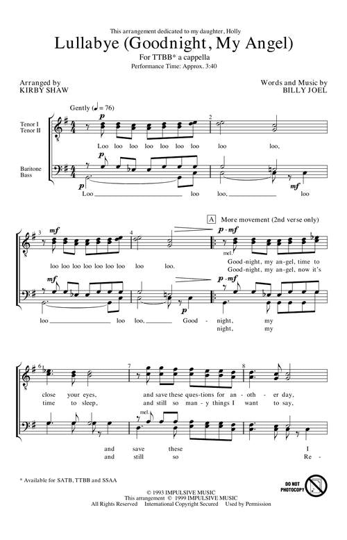 Lullabye Goodnight My Angel Ttbb A Cappella Billy Joel