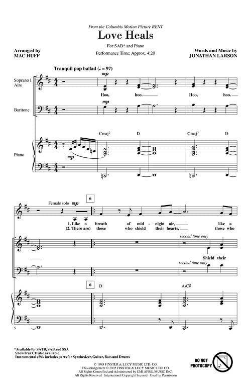 This Title Comes In Quantities Of Five (5) Copies(1 Order=5 Copies) Love Heals from the Columbia Motion Picture RENT Composer: Jonathan Larson (arr. Mac Huff) Publisher: Category: Choral Series: Broadway Choral Format: Voicing: SAB The blockbuster...Regular price $21.99 -