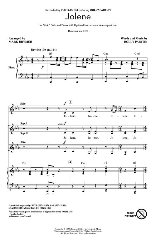 Jolene Pop Choral Series Ssa And Solo Dolly Parton