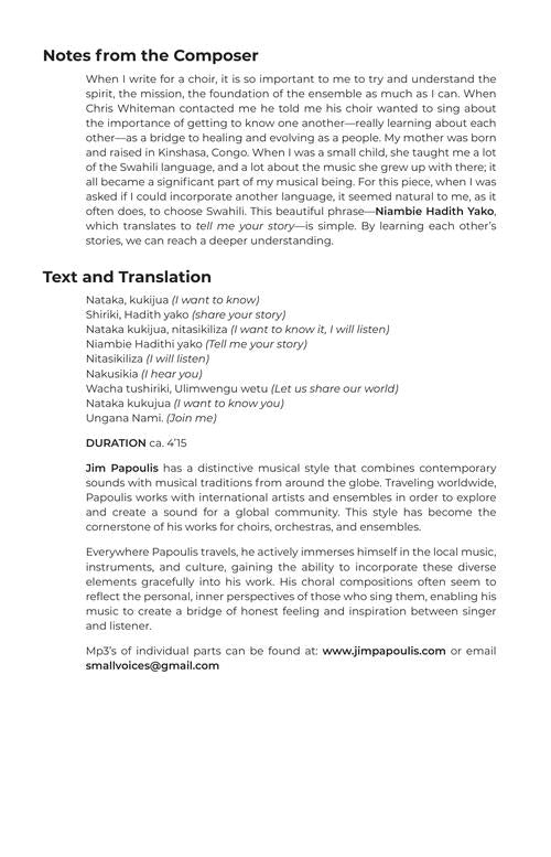 Niambie Hadithi Yako (tell Me Your Story) Small Voices SSA Jim Pa