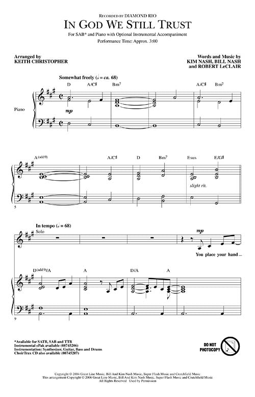 This Title Comes In Quantities Of Five (5) Copies(1 Order=5 Copies) In God We Still Trust Artist: Diamond Rio arr. Keith Christopher Publisher: PraiseSong Category: Choral Series: PraiseSong Choral Format: Voicing: SAB This poignant song by...Regular price $20.99 -