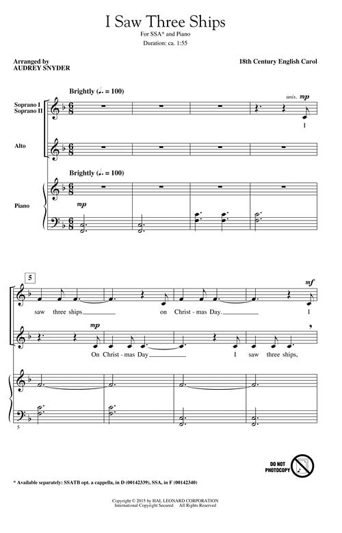 This Title Comes In Quantities Of Five (5) Copies(1 Order=5 Copies) I Saw Three Ships SSATB OPTIONAL A CAPPELLA Your mixed and treble choirs will sparkle when performing this exuberant setting of the traditional English carol!...Regular price $26.99 -