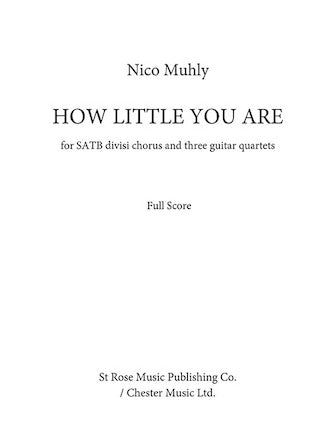 How Little You Are for SATB divisi chorus and three guitar quartets Publisher: Chester Music Category: Choral Series: Choral Format: Octavo Nico Muhly's How Little You Are was composed in 2015 and is arranged for SATB...Regular price $17.99 -