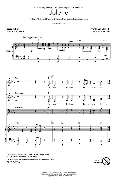 Jolene Pop Choral Series Sab And Solo Dolly Parton