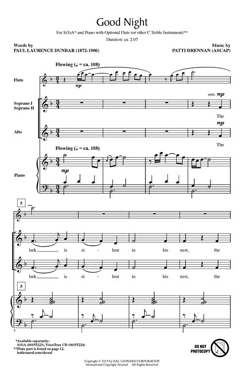 This Title Comes In Quantities Of Five (5) Copies(1 Order=5 Copies) Good Night Discovery Level 2 Octavo SA with optional 2nd sop A poem by acclaimed African American writer Paul Laurence Dunbar is set in the...Regular price $22.99 -