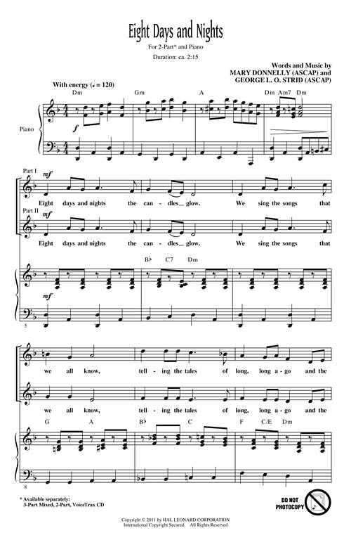 This Title Comes In Quantities Of Five (5) Copies(1 Order=5 Copies) Eight Days and Nights 2-Part Composer: George L.O. Strid Item# 08552297 Sheet MusicRegular price $21.99 -