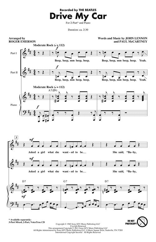This Title Comes In Quantities Of Five (5) Copies(1 Order=5 Copies) Drive My Car 2-Part Artist: The Beatles Item# 08552372 Sheet MusicRegular price $23.99 -