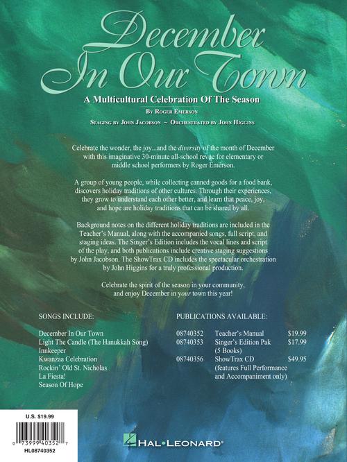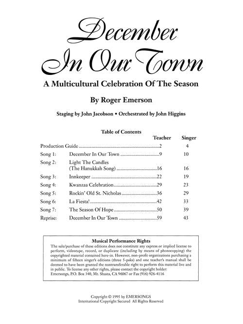 Composer: Roger Emerson December in Our Town (A Multicultural Holiday Musical) Publisher: Hal Leonard Category: Choral Series: Music First Express Format: Paperback 'A Multicultural Celebration of the Season.' Staging by John Jacobson. Orchestrated by John Higgins....Regular price $27.99 -