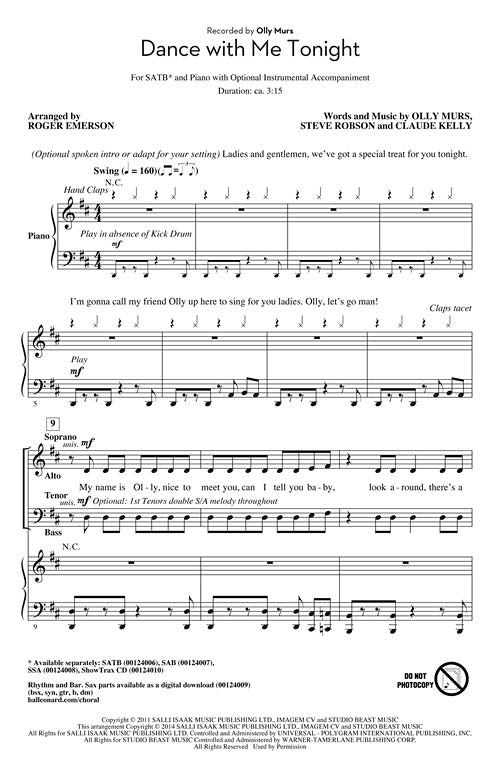 Dance With Me Tonight Pop Choral Series Ssa Olly Murs