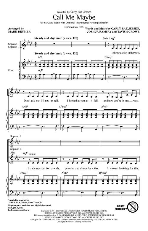 Call Me Maybe Pop Choral Series Ssa Carly Rae Jepsen