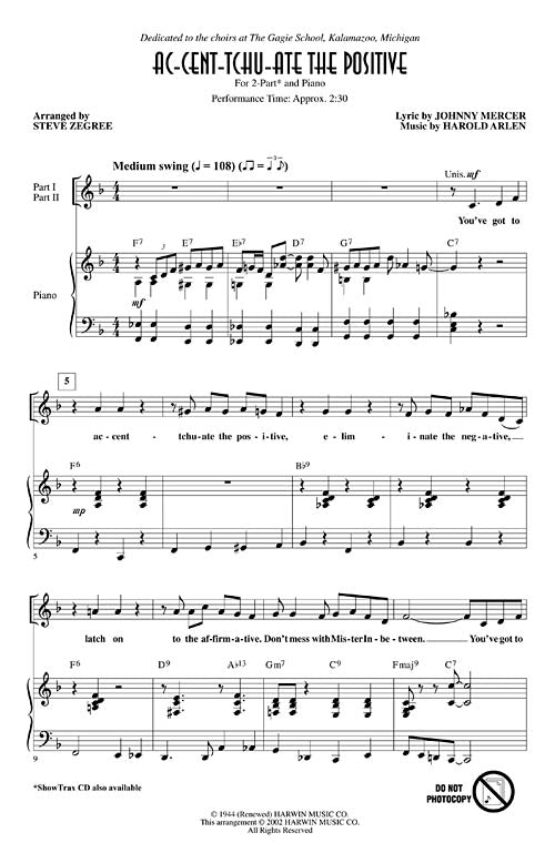 This Title Comes In Quantities Of Five (5) Copies(1 Order=5 Copies) Ac-cent-tchu-ate the Positive Octavo 2-Part Treble Your singers will love developing style and technique while performing this jazz arrangement of the famous Harold Arlen/Johnny Mercer...Regular price $26.99 -