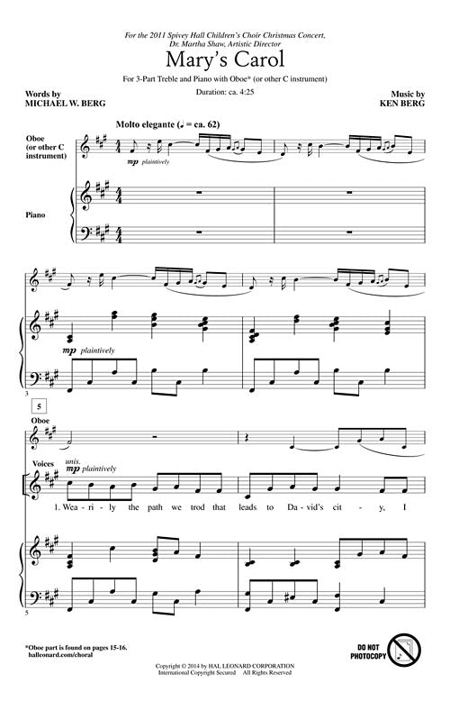 This Title Comes In Quantities Of Five (5) Copies(1 Order=5 Copies) Mary's Carol 3-Part Treble This elegant and artful setting expresses the depth of thought and emotion, fear and excitement, wonder and awe at the miraculous...Regular price $27.99 -