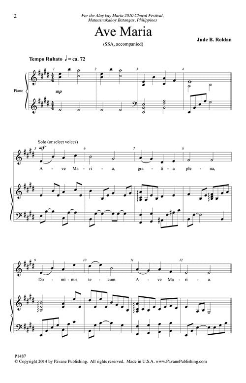 This Title Comes In Quantities Of Ten (10) Copies. 1 Order = 10 Individual Copies Ave Maria SSA Jude Roldan is pianist/composer for the world famous Hail Mary the Queen Children's Choir of the Philippines, directed...Regular price $25.99 -
