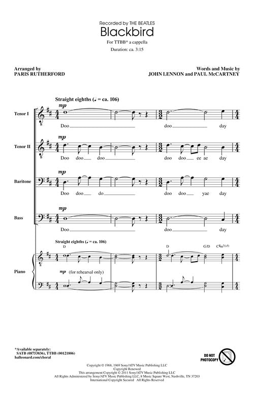 Blackbird Pop Choral Series Ttbb A Cappella Lennon J Mccartney