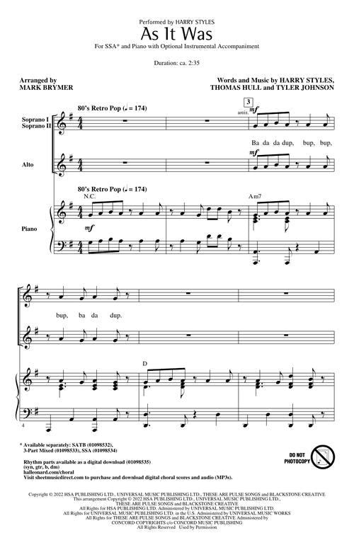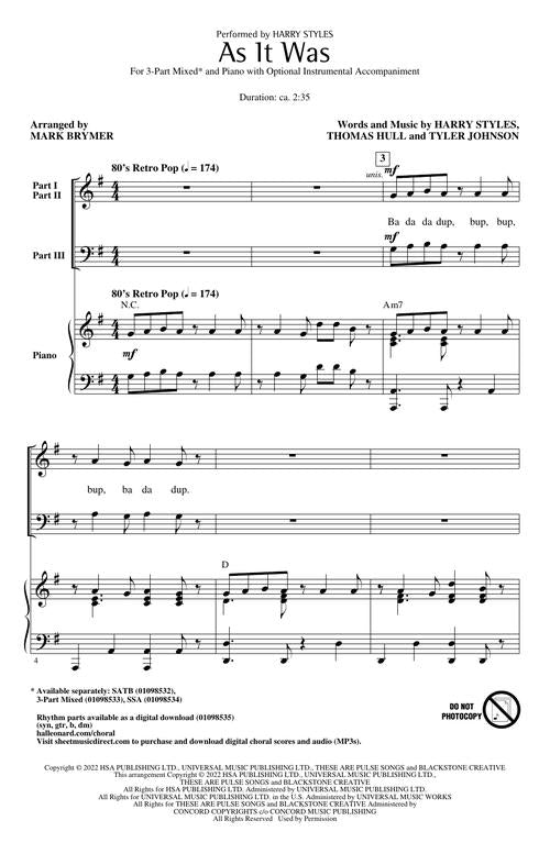 As It Was 3 Part Mixed Pop Choral Series Harry Styles