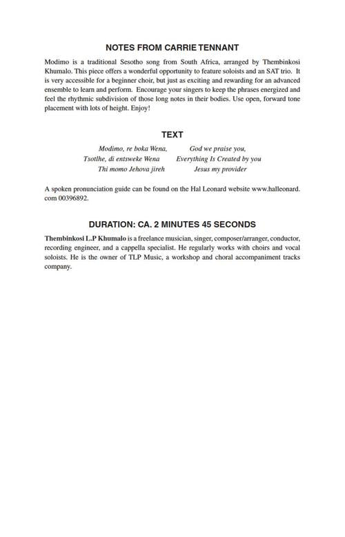 Modimo Re Boka Wena Carrie Tennant Choral Series Satb Arranger