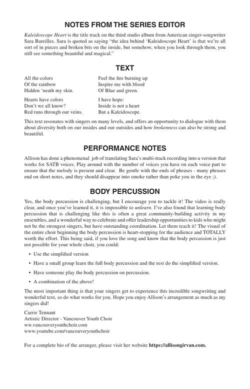 Kaleidoscope HeartCarrie Tennant Choral SeriesPublisher: Hal LeonardCategory: ChoralSeries: Carrie Tennant Choral SeriesFormat: OctavoAs the title suggests, Kaleidoscope Heart is a metaphor for the ever-changing beauty and diversity of the heart and soul. As the introductory song...Regular price $29.99