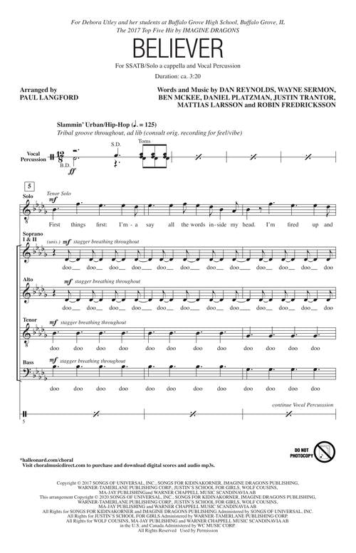 Believer Ssatb A Cappella Pop Choral Series Imagine Dragons