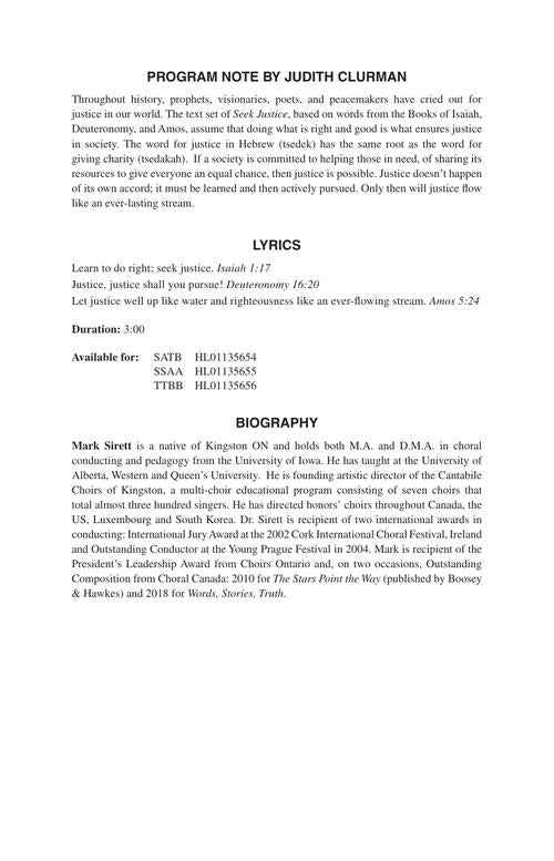 This Title Comes In Quantities Of Five (5) Copies(1 Order=5 Copies) Seek Justice Publisher: Hal Leonard Category: Choral Series: Judith Clurman Choral Series Format: Octavo Throughout history, prophets, visionaries, poets, and peacemakers have cried out for...Regular price $27.99 -