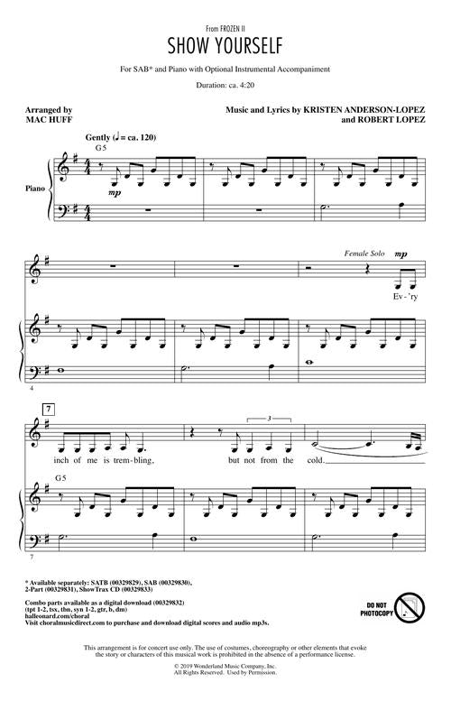 Show Yourselffrom Frozen 2Publisher: Hal LeonardCategory: ChoralSeries: Disney ChoralFormat: OctavoIntriguing themes of purpose and sense of self are stunningly explored in this climactic refrain from composers Kristen Anderson-Lopez and Robert Lopez, who gather motifs from songs...Regular price $27.99 -