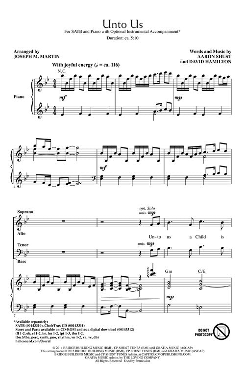 This Title Comes In Quantities Of Five (5) Copies(1 Order=5 Copies) Unto Us SATB Uses: General, Advent, Christmas, Praise Team Scripture: Isaiah 9:6 A beloved scripture from Isaiah is set ablaze in this song from Aaron...Regular price $27.99 -