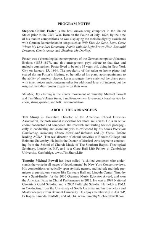 Slumber My DarlingPublisher: Hal LeonardCategory: ChoralSeries: Henry Leck Creating ArtistryFormat: OctavoSlumber My Darling is one of Stephen Foster's more mature compositions, displaying the melodic dignity associated with German Romanticism. Using a soft rolling accompaniment that alternates...Regular price $25.99 -