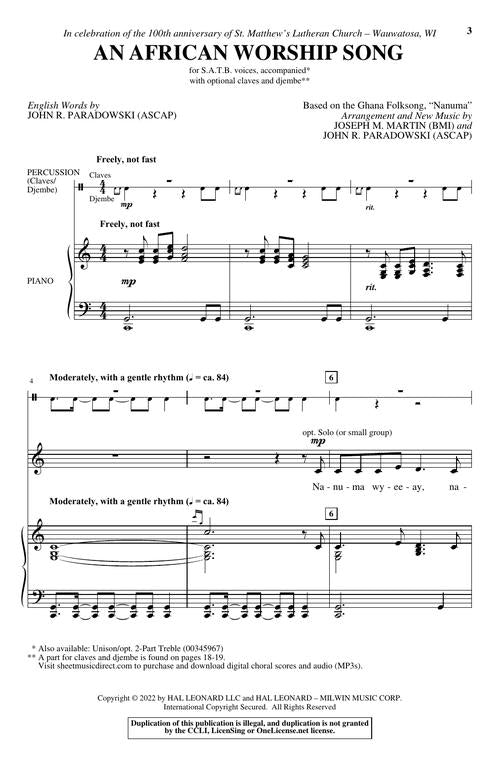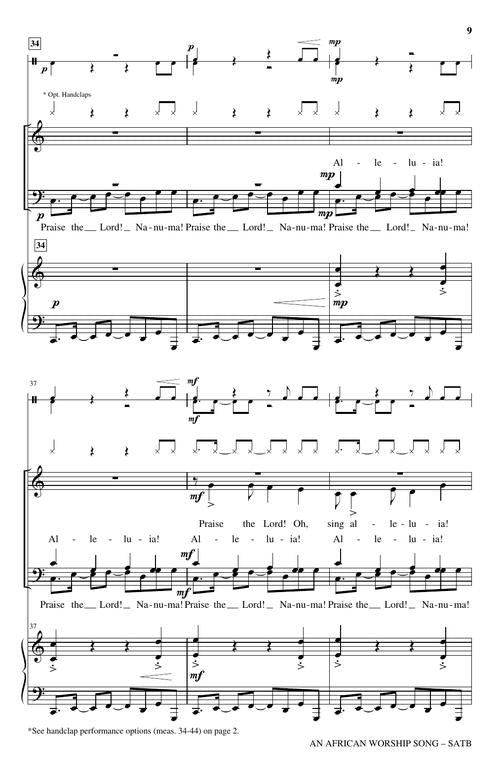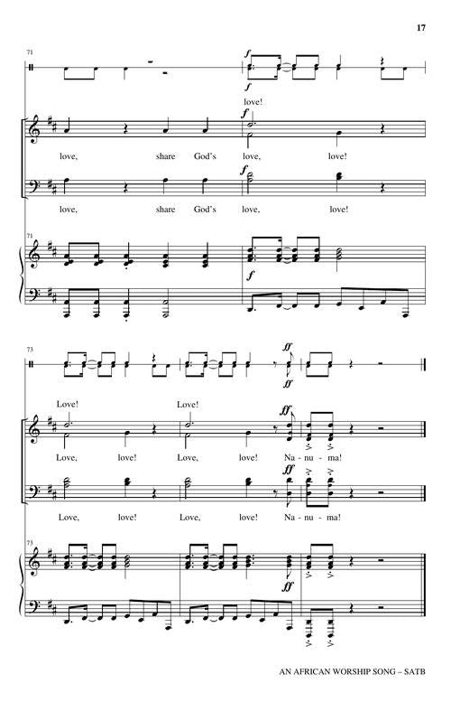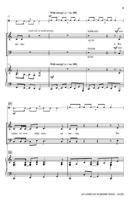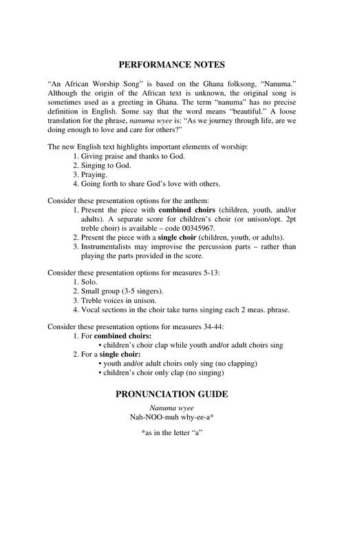 Based on the Ghana folksong, Nanuma, this anthem highlights important elements of worship: praising God in song, praying, and going forth to share God's love. Written for children, youth, and adults, the piece can be sung by one choir or multiple choirs combined for an intergenerational presentation. Handclaps, percussion instruments, and a rhythmic piano accompaniment join with other options to create an unforgettable multicultural experience. Available separately: SATB, Unison/opt. 2-Part Treble. Duration: 3:25