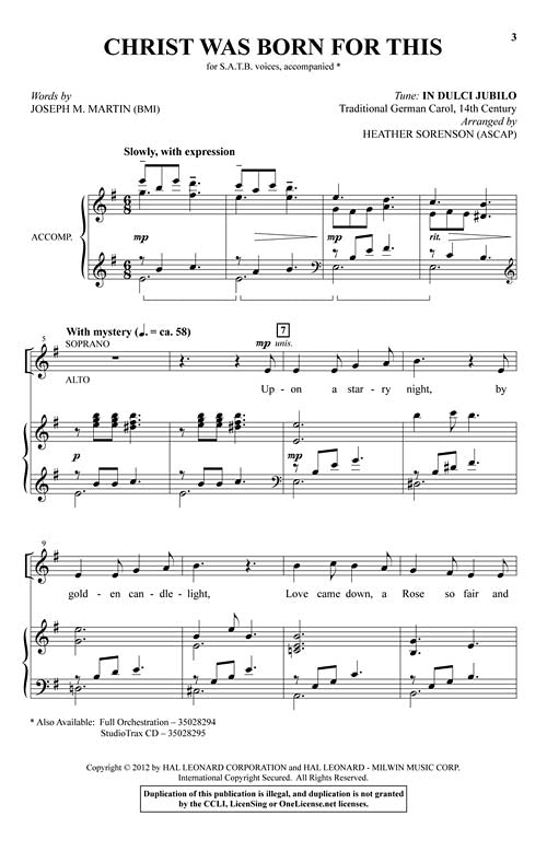 Uses: Christmas, Communion Scripture: John 3:16; Isaiah 7:14; Galatians 4:4 The final words, Christ was born for this, from the traditional carol, Good Christian Men, Rejoice, form the foundational textural concept of this new carol. The carol's tune is realized in minor and expressively altered reminding the listener that Christ was born for a divine purpose. We find ourselves looking beyond the manger to the cross. The music is cinematic in character and brings a soundtrack aspect to this message of grace. The interweaving of In Dulci Jubilo and Carol of the Bells is masterful. Available separately: SATB, StudioTrax CD, Orchestration CD-rom (Score & parts for Flute 1&2, Oboe, Clarinet 1&2, Bassoon, Horn 1&2, Trumpet 1, Trumpet 2&3, Trombone 1&2, Bass Trombone/Tuba, Timp, Perc 1&2, Harp, Violin 1, Violin 2, Viola, Cello, Double Bass). Duration: ca. 3:26.