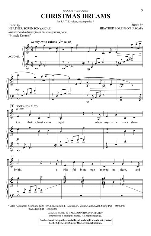 Uses: Christmas, Christmas Eve Scripture:Luke 2:19; Acts 2:17; Genesis 40:8 A truly singular perspective on the miracle of Christmas is contained in the meaning of this graceful original song. An expressive melody rises and falls with deep longing as Christmas dreams of the characters are revealed. The delicate music box-like piano part adds to the theatre of this message of hope. A touching testimony to the wonder of Christmas! Available separately: SATB, StudioTrax CD (Accompaniment, SplitTrax, Performance), Orchestration (score and parts for oboe, horn in F, percussion, violin, cello, synth. string pad). Duration: ca. 4:54.