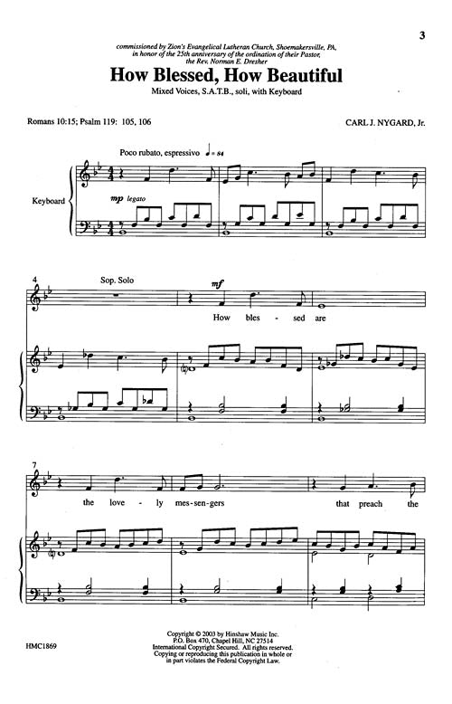 If Mendelssohn's How Lovely Are the Messengers is a bit outside the reach of your choir, try Carl Nygard's moving setting of texts from Romans and Psalm 119. Difficulty Level: Medium Adult. Duration - 00:03:12.