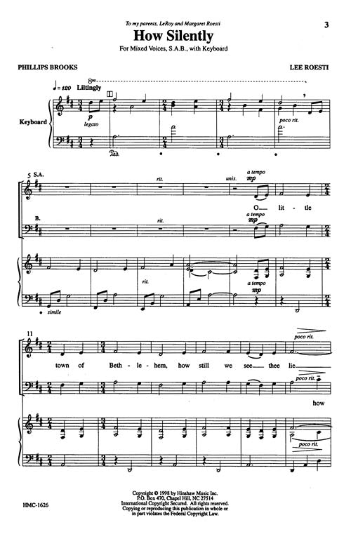 For a medium junior high or high school or easy adult choir. This is a beautiful, lilting melody by Lee Roesti meant for any Christmas concert, encompassing the traditional Christmas carol O Little Town of Bethlehem. Duration - 00:03:21.