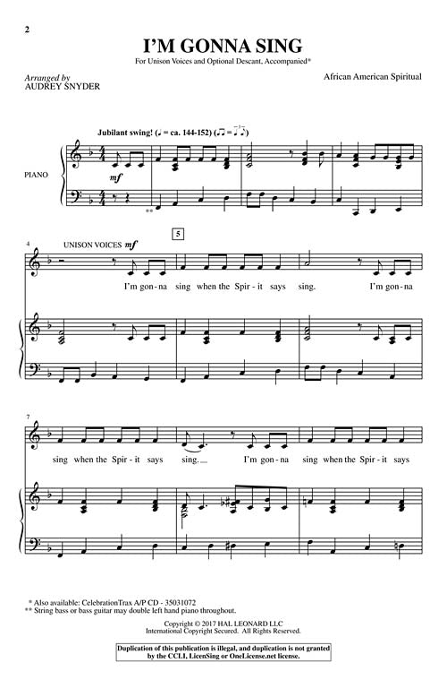 Handclaps, spoken refrains, and a dynamic piano accompaniment make this jubilant arrangement of the familiar spiritual a perfect selection for older elementary choirs or choirs of any age. The final verse includes an optional descant that heightens the sense of joy and exuberance found in this rapturous piece. Available separately: Unison/opt. 2-Part Treble, CelebrationTrax CD. Duration: ca. 1:48 href=https://youtu.be/FmnhbkFbIW8 target=_newScorePlay - click to view score with recording./