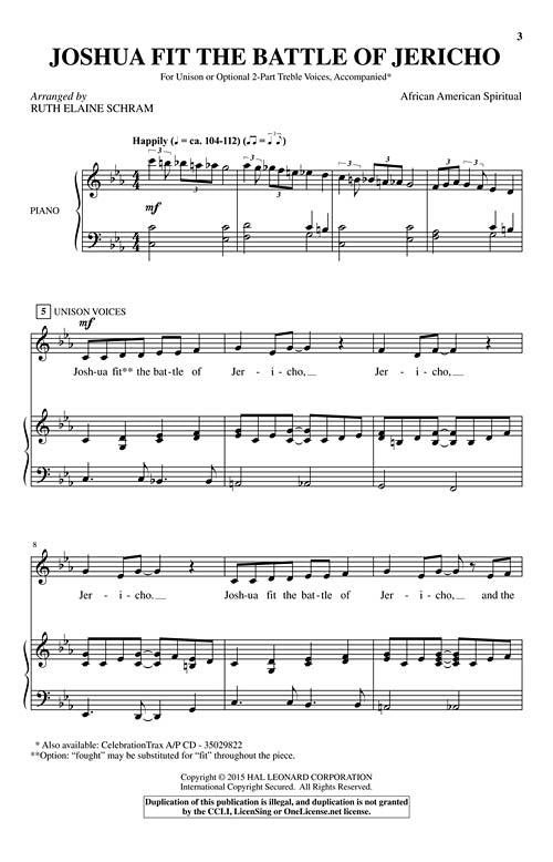 Uses: General Scripture: Joshua 6:1-20 This accessible arrangement of the familiar African American spiritual makes an ideal selection for older children's choir as well as youth or adult choirs. A well-crafted accompaniment nicely supports the vocals while also painting a picture of Jericho's tumbling walls using descending chromatic patterns heard during the song's introduction and interludes. Available separately: Unison/opt. 2-Part Treble, CelebrationTrax CD. Duration: ca. 3:09 href=https://youtu.be/Mo-QzuvmFes target=_newScorePlay - click to view score with recording./