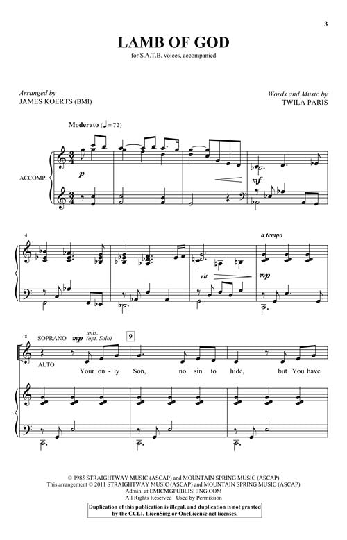 Uses: Holy Week, Praise Team Scripture: John 1:35-36; John 1:29; Revelation 5:4-14 This classic, hymn-like praise and worship song travels freely from contemporary sanctuaries to traditional halls alike. Appearing in hymnals everywhere, Twila Paris' poignant song has become a standard. The arrangement is straight-forward and thoughtfully presented in choral format as a testament to the grace and mercy of Christ.