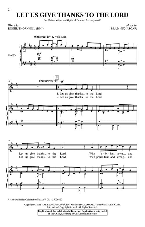 Uses: Thanksgiving, General Scripture: Psalm 107:1; Psalm 136:1; Psalm 118:1 Joy and energy abound in this irresistible thanksgiving anthem that includes a brief portion of the hymn, For the Beauty of the Earth. Repetition in both text and melody make the piece a snap to learn. And an easy, optional descant gives budding two-part choirs a chance to shine as the anthem comes to a close. Available separately: Unison/opt. 2-Part Treble, CelebrationTrax CD. Duration: ca. 2:37 href=https://youtu.be/5daOx3xqMac target=_newScorePlay - click to view score with recording./