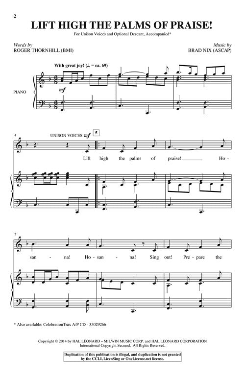 Uses: Palm Sunday Scripture: Matthew 21:1-11; Luke 19:28-38 Triumphant and joyful, this Palm Sunday piece urges one and all to lift high the palms of praise and prepare the way for David's royal Son. A lilting 6/8 meter provides a celebratory processional feel while also enhancing the spirited piano accompaniment. Available separately: Unison/opt. 2-Part Treble, CelebrationTrax CD. Duration: 2:21 href=https://youtu.be/u7rcy1U6AQc target=_newScorePlay - click to view score with recording./