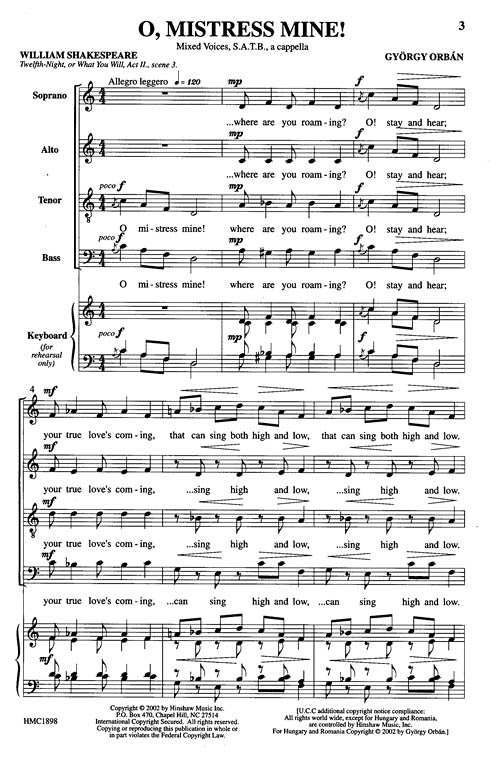 Hungarian composer Gyorgy Orban arranged this Shakespeare text for a cappella mixed voices. Works well with high school or adult choirs. Difficulty Level: Medium Advanced Middle School, High School or Medium Adult. Duration - 00:01:00.