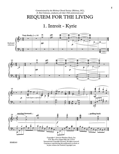 Commissioned by the Hickory NC Choral Society for their 35th anniversary season. Scored for mixed choir with solos for boy soprano and/or mezzo-soprano, soprano and tenor, the instrumentation is available for large orchestra or chamber ensemble. Combining both liturgical and non-liturgical texts, in some cases the traditional texts are slightly re-arranged for contextual emphasis. This powerful five movement work projects a wide range of meaningful expression from a biting essay on the vanity and pain of existence, to a plea for mercy, and a celebration of eternal light. The work stands alone - but would be especially moving for all saints, Good Friday, or even Palm Sunday.