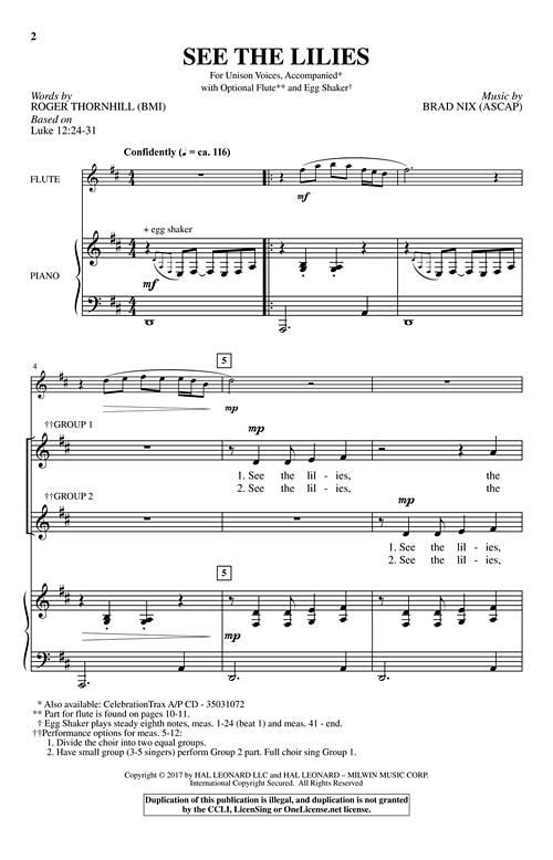 Based on Luke 12:24-31, this anthem reminds us that just as God cares for the lilies of the field and the birds of the air, so, too, will God care for His children. Crafted in a calypso feel, the simple melody and gentle syncopations are tastefully accompanied by piano, optional flute, and optional egg shakers. Available separately: Unison, CelebrationTrax CD. Duration: ca. 2:57 href=https://youtu.be/y5kxx4maYZU target=_newScorePlay - click to view score with recording./