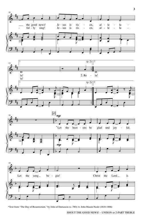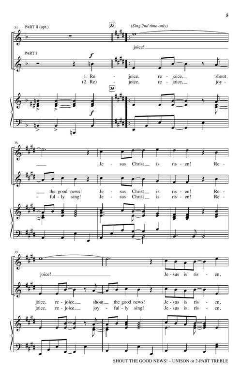 Rejoice, rejoice! Shout the good news! Jesus Christ is risen! These words of jubilation permeate this dynamic Easter anthem perfect for older elementary or younger youth choirs. The celebratory A section later combines with an optional descant that brings the piece to a glorious conclusion.
