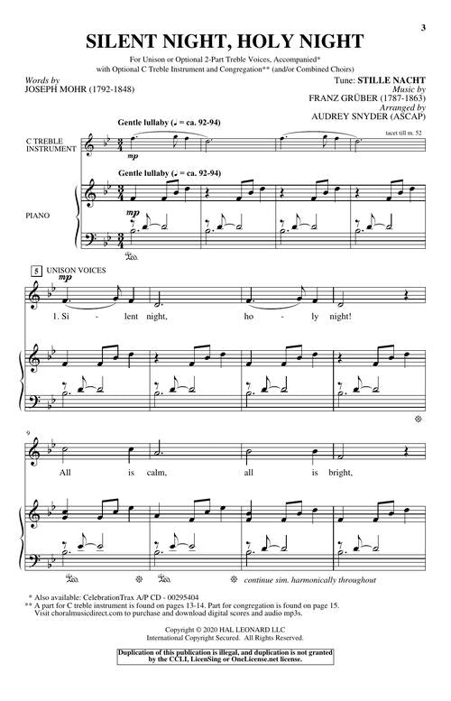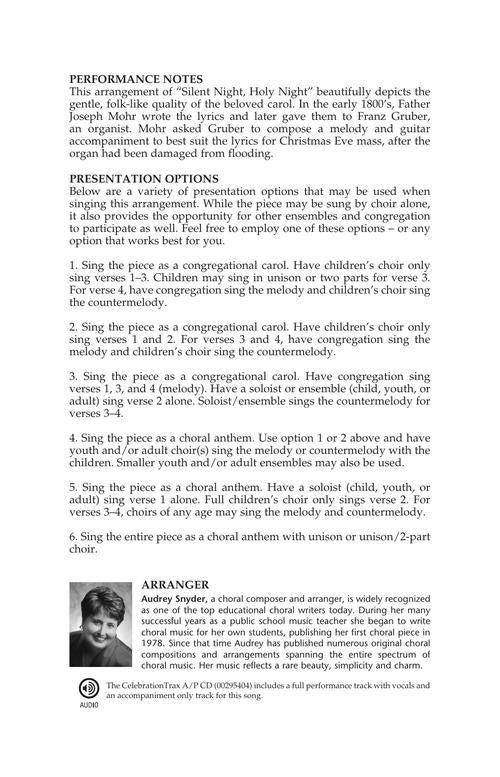 Brimming with presentation options, this arrangement of the cherished Christmas carol beautifully depicts the peaceful, folk-like quality for which it is known. Although a choir may sing the piece alone, the anthem also provides suggestions for other ensembles and congregation to participate as well. A lovely counter-melody joins the traditional melody in verses 3 and 4 making it a terrific anthem for combined choirs and/or congregation. Available separately: Unison/opt. 2-Part Treble, CelebrationTrax CD. Duration: ca. 3:34