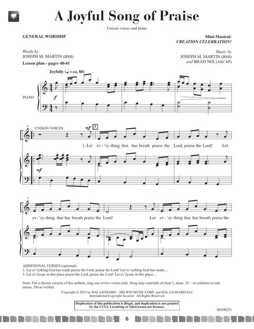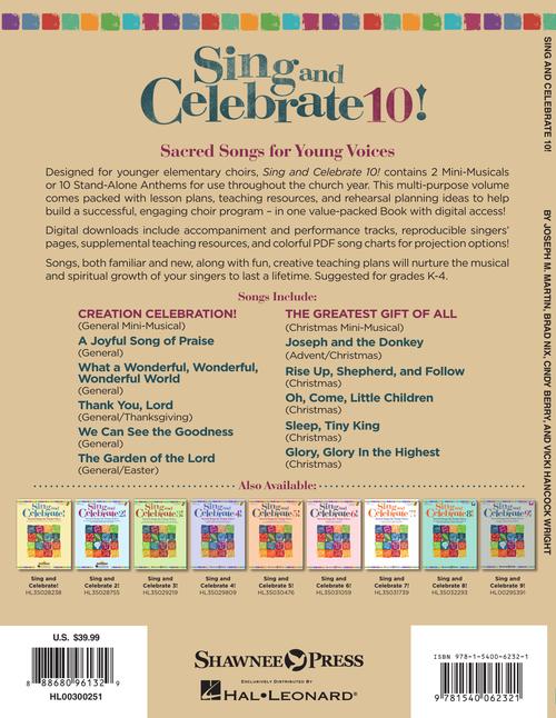 Sing and Celebrate 10! honors the tenth anniversary of this outstanding series for sacred, younger elementary choirs! This special, multi-purpose volume contains 2 Mini-Musicals or 10 Stand-Alone Anthems for use throughout the church year. Each mini-musical provides five songs with age-appropriate scripts plus flexible suggestions for sets, props, staging, costumes, and cast assignments. The songs in each mini-musical may also be sung separately as individual anthems. Sing and Celebrate 10! comes packed with creative lesson plans, teaching resources, and rehearsal planning ideas necessary for building a successful, engaging choir program-in one value-packed Book with digital download access! Digital downloads include accompaniment and performance tracks, reproducible singers' pages, supplemental teaching resources, and colorful PDF song charts for projection options. Like every volume in the series, Sing and Celebrate 10! promises to nurture the musical and spiritual growth of your singers to last a lifetime. Included in this volume are Creation Celebration! (General Mini-Musical) and The Greatest Gift of All (Christmas Mini-Musical). Also available in the Sing and Celebrate! series: the original Sing and Celebrate! (35028238), Sing and Celebrate 2! (35028755), Sing and Celebrate 3! (35029219), Sing and Celebrate 4! (35029809), Sing and Celebrate 5! (35030476), Sing and Celebrate 6! (35031059), Sing and Celebrate 7! (35031739), Sing and Celebrate 8! (35032293), Sing and Celebrate 9! (00295391)