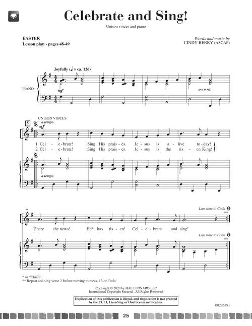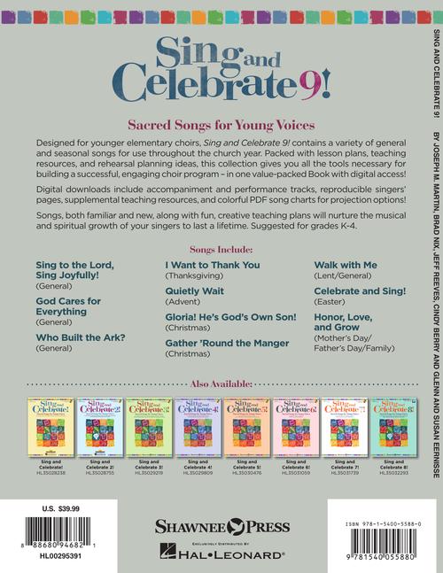 Sing and Celebrate 9! provides everything you need for developing younger elementary choirs in your church! Designed for grades K-3, Sing and Celebrate 9! contains a variety of general and seasonal songs for use throughout the church year. Packed with lesson plans, teaching resources, and rehearsal planning ideas, this collection gives you all the tools necessary for building a successful, engaging choir program - in one value-packed Book with digital download access! Digital downloads include accompaniment and performance tracks, reproducible singers' pages, supplemental teaching resources, and colorful PDF song charts for projection options! Songs, both familiar and new, along with fun, creative teaching plans will nurture the musical and spiritual growth of your singers to last a lifetime. Songs include: Sing to the Lord, Sing Joyfully! (General), God Cares for Everything (General), Who Built the Ark? (General), I Want to Thank You (Thanksgiving), Quietly Wait (Advent), Gloria! He's God's Own Son (Christmas), Gather 'Round the Manger (Christmas), Walk with Me (Lent/General), Celebrate and Sing! (Easter), Honor, Love, and Grow (Mother's Day/Father's Day/Family). Also available in the Sing and Celebrate! series: the original Sing and Celebrate! (35028238), Sing and Celebrate 2! (35028755), Sing and Celebrate 3! (35029219), Sing and Celebrate 4! (35029809), Sing and Celebrate 5! (35030476), Sing and Celebrate 6! (35031059), Sing and Celebrate 7! (35031739), Sing and Celebrate 8! (35032293)