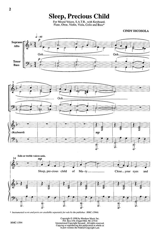 In a tune and text of rare freshness by Cindy Di Cosola, the infant Jesus is called to rest and the world looks on in awe. Difficulty Level: Medium Middle School, High School or Easy Adult. Duration - 00:02:57.