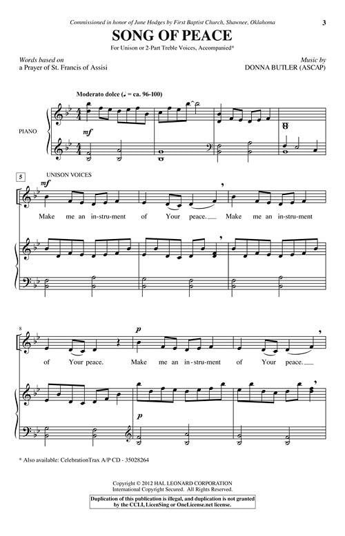 Uses: General, World Peace Scripture: Luke 6:31 In this stirring anthem, the powerful words of St. Francis of Assisi teach us to be instruments of God's peace and love. A beautiful, legato melody highlights the song's message as a gentle piano accompaniment sweetly supports the vocals. Available separately: Unison/opt. 2-Part Treble, CelebrationTrax CD. Duration: ca. 2:32 href=https://youtu.be/pwotwaBttPI target=_newScorePlay - click to view score with recording./