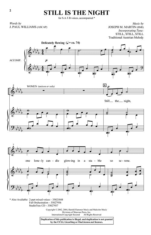 Uses: Christmas Eve, Christmas, Communion Scripture: Luke 2:1-7 In this tender lullaby to the newborn Christ, J. Paul Williams at his poetic best joins with Joseph Martin in a simply scored anthem that is profoundly effective for candlelight Christmas observances. The quoting of the beloved German carol Still, Still, Still, adds to the charm of this simple, beautiful, and moving anthem.