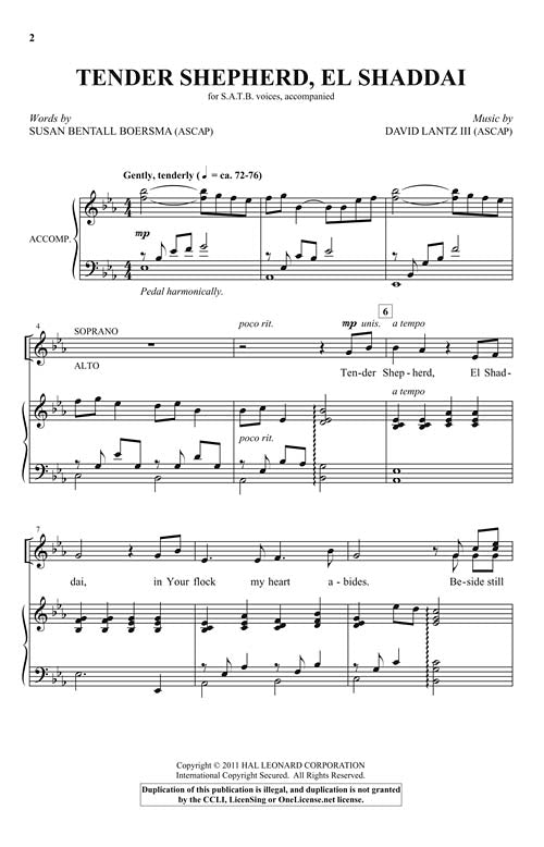 Uses: Christ the Shepherd, General Scripture: Psalm 23; Isaiah 66:10-13 Comforting words adapted from the Psalms display the tenderness and nurturing leadership of Christ, the Good Shepherd. Using the Hebrew name, El Shaddai (the God who supplies our needs), the text reminds us of God's provision for our life. God desires to bless and give us an abundant life and the lush musical substance of this choral ballad helps connect this promise to the heart of the listener.